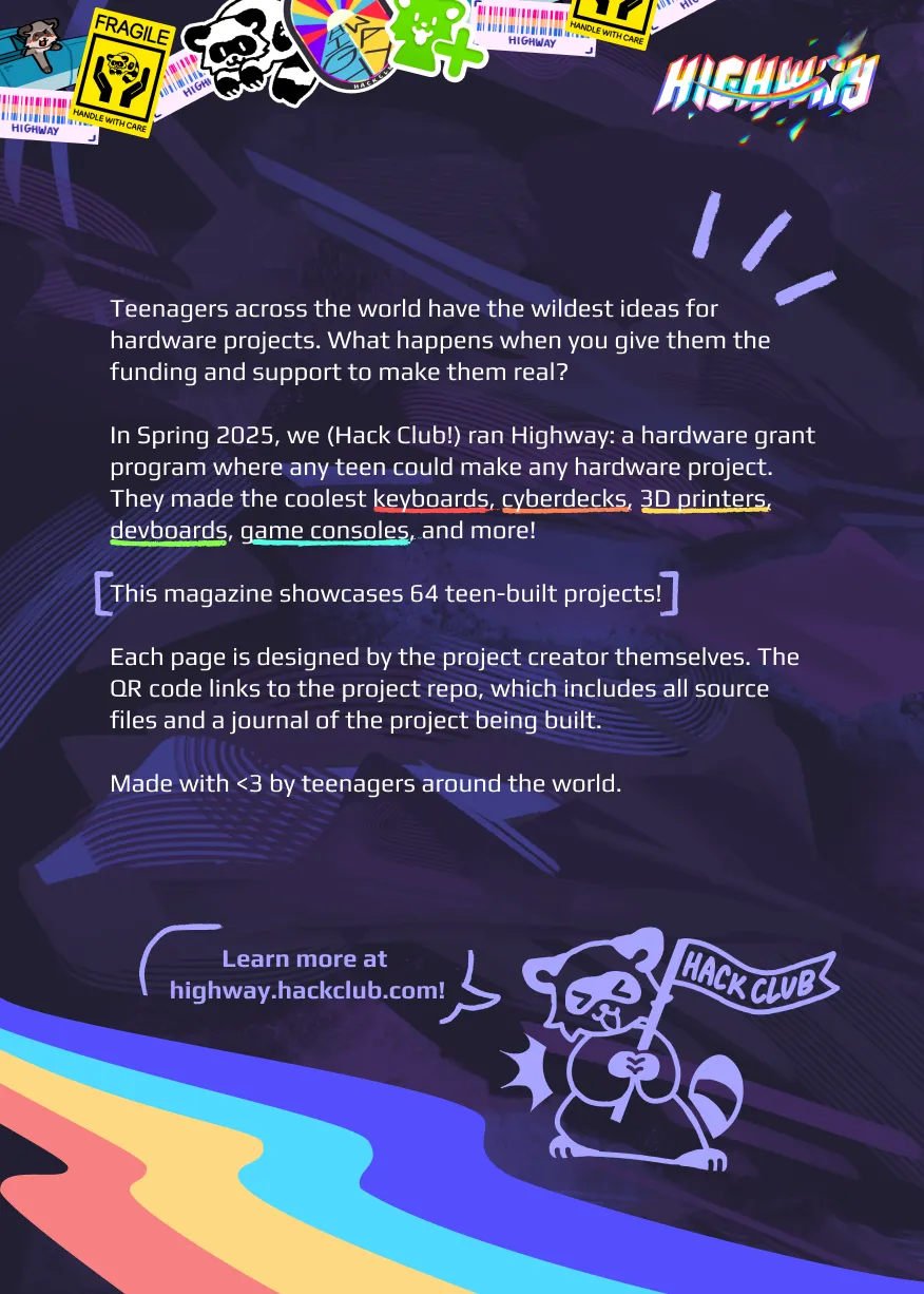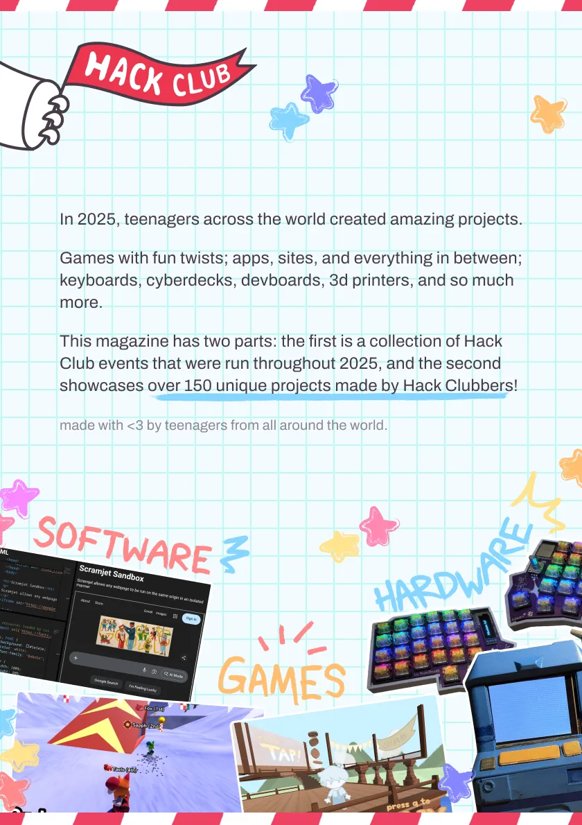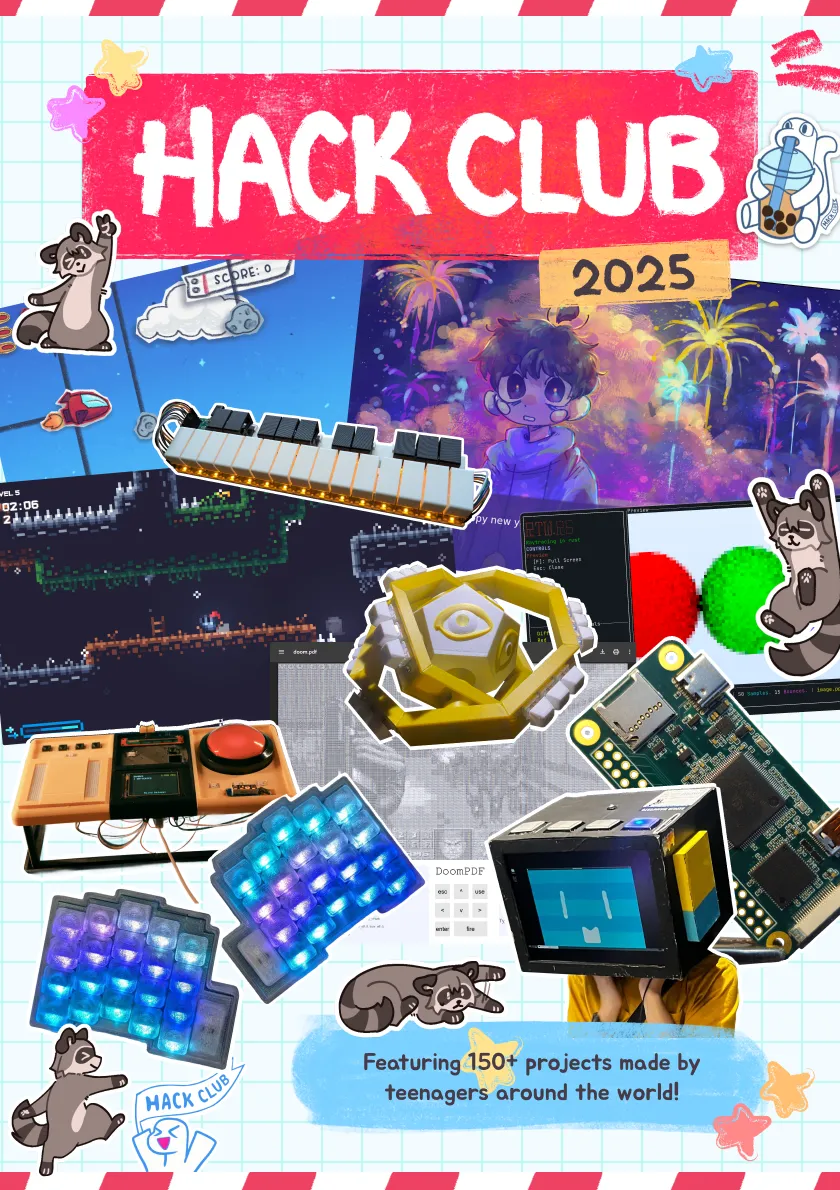 The Hack Club showcase. 158 awesome projects made by 100 Hack Clubbers in 2025, all in one magazine. Each teenager designed their own page to show off their project to you.